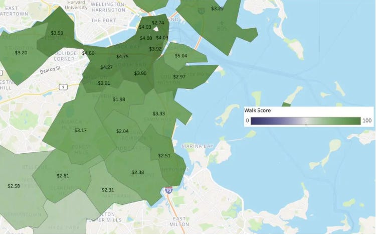 The data highlights the correlation between walkability and rental rates. Walkable areas tend to command higher rents due to convenience and amenities. As Boston continues to enhance walkability, property values and rental rates are likely to benefit.