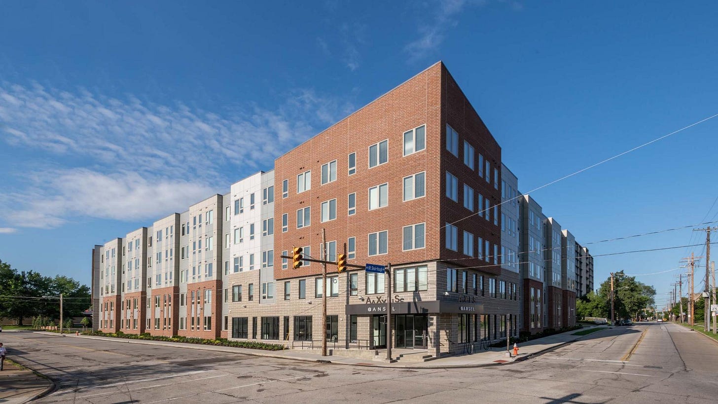 Axis at Ansel — 1750 Ansel Road One hundred sixty-three market-rate and mixed-use units delivered by Signet Real Estate at a development cost of thirty-five million dollars. The Ansel Road location sits at the intersection of the University Circle institutional cluster and the Hough neighborhood to the north — a position that captures demand from both the healthcare employment anchor and the broader East Side residential market that has been strengthening as the Opportunity Corridor activates surrounding corridors.