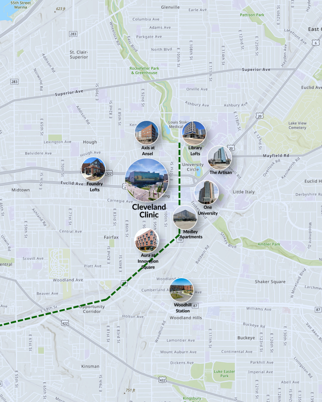 The most significant completed residential development on the East Side is concentrated along the Euclid Corridor between downtown and University Circle — the same spine the Health-Tech Corridor runs along. These projects were built into demonstrated institutional demand and have established the University Circle area as a genuine residential submarket with multiple competing properties at different price points.