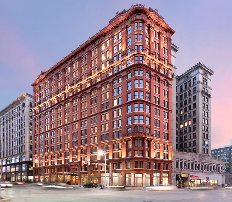Schofield Building — 2000 East Ninth Street One of the earlier mixed-use hybrid conversions in the market, combining a Kimpton hotel on the lower floors with residential apartments above — a program that demonstrated adaptive reuse in Cleveland could support hospitality and residential uses simultaneously. The fifty-million-dollar renovation preserved the building’s ornate original exterior while delivering contemporary units, establishing the template for subsequent projects that combined historic preservation with modern residential programming.