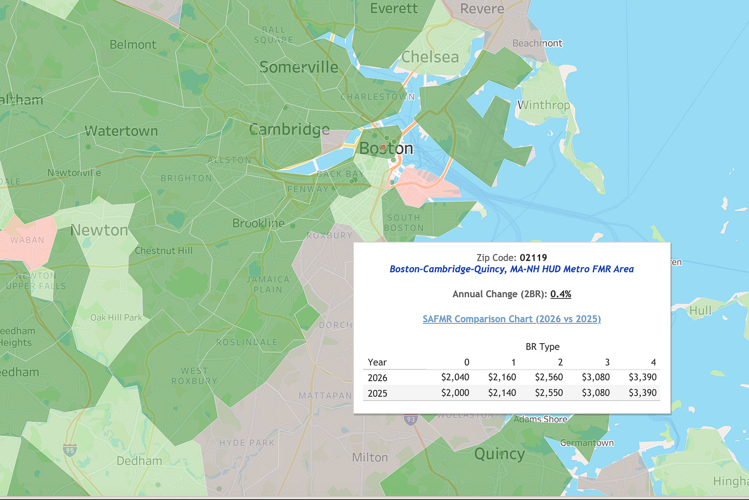 The Boston story is also a study in intra-metro variation. The heat map across the Boston metro shows a range from deep red to deep green within a few miles — some ZIPs declining, others appreciating, others flat. The metro-level FMR obscures all of it. This is precisely why the Section 9-14 threshold test in the RCS uses the ZIP-level SAFMR rather than the metro FMR — and why a property in Roxbury and a property in a suburban Boston ZIP can have completely different market position stories even though they are in the same HUD Metro FMR Area.