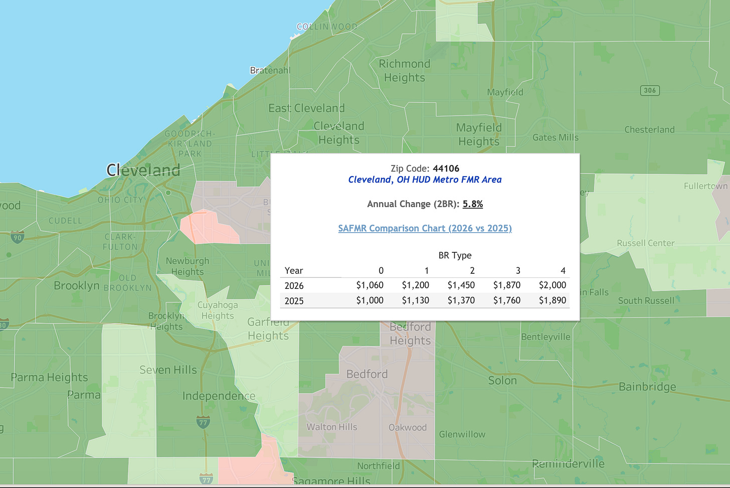 ZIP code 44106 sits in the University Circle and East Side corridor that has been central to Cleveland’s multifamily narrative for the past several years. The FY2026 SAFMR for a two-bedroom unit in this ZIP is $1,450 — up from $1,370 in FY2025. That is a 5.8% annual increase, roughly in line with Ohio’s FY2026 OCAF of 4.9%.
