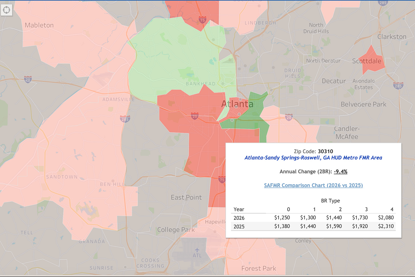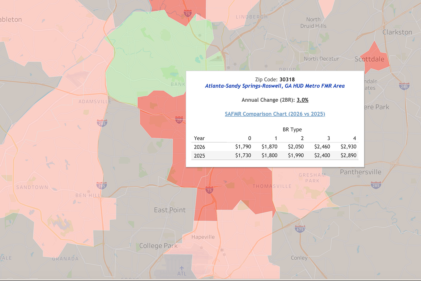 For Section 8 owners in Atlanta, the ZIP code is not a detail — it is the analysis. An owner in 30310 whose contract rent was set against FY2025 SAFMR levels is now holding a rent structure that may look more aligned to the current market than it did a year ago, but that still may reflect years of accumulated below-market positioning from prior periods of appreciation. An owner in 30318 is in a market that has been growing steadily and where the SAFMR-to-contract-rent gap may be widening rather than closing.