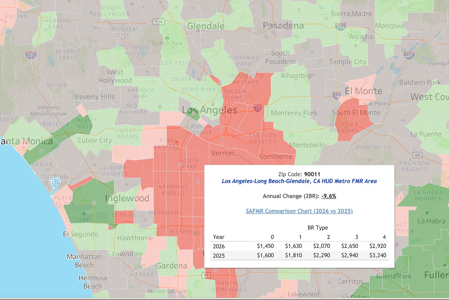 ZIP 90011 — South Los Angeles — recorded a FY2026 2BR SAFMR of $2,070, down from $2,290 in FY2025. A 9.6% annual decline. California FY2026 OCAF is 4.9%.