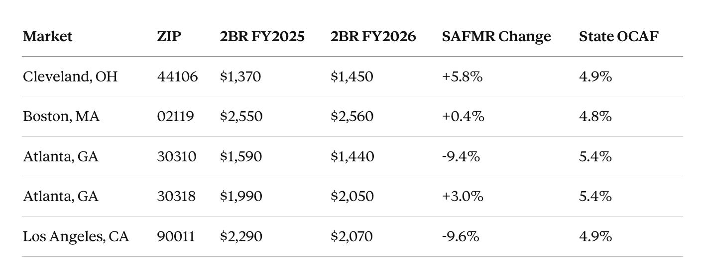 That gap — between what OCAF tracks and what the local rental market is actually doing — is what the SAFMR data makes visible. And across four markets in FY2026, that gap looks very different depending on where you are.