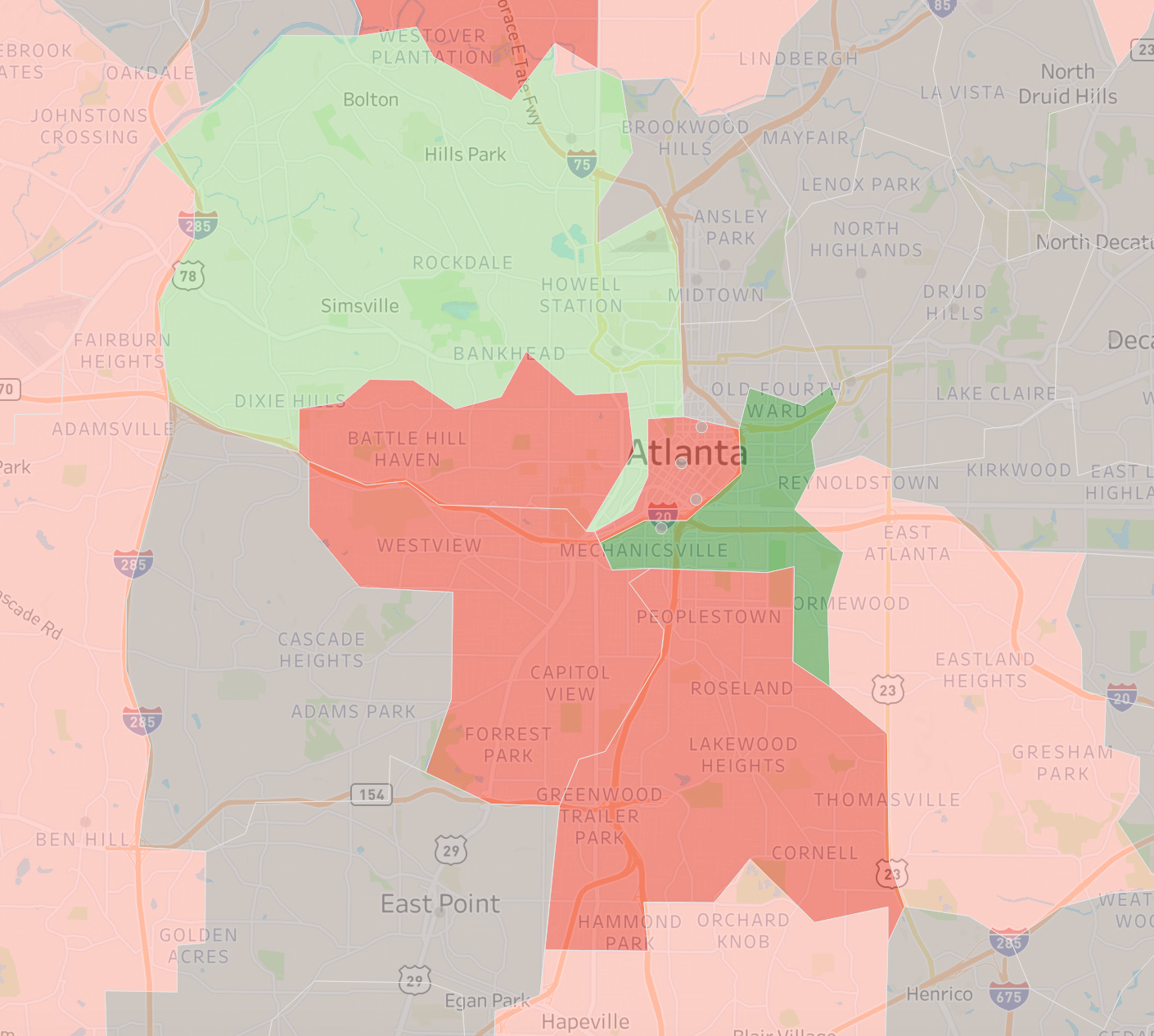 Atlanta’s heat map does something none of the other cities do quite as dramatically: it shows the intra-metro contrast in a single frame. The screenshots from the MarketRent™ SAFMR Heat Map show two Atlanta ZIPs within a few miles of each other telling opposite stories.