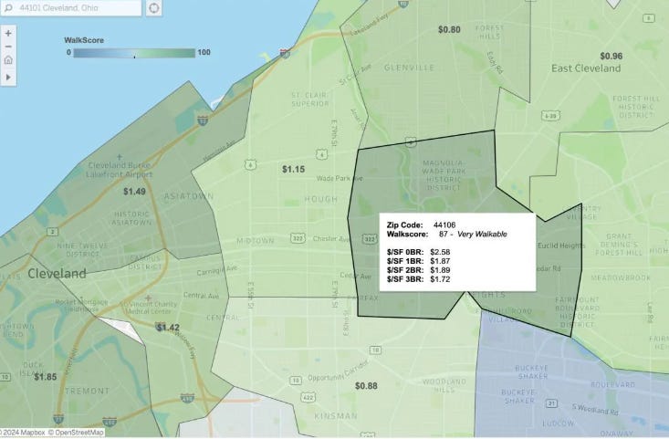 The data highlights the correlation between walkability and rental rates. Walkable areas tend to command higher rents due to convenience and amenities. As Cleveland continues to enhance walkability, property values and rental rates are likely to benefit.